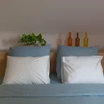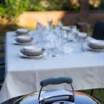 The kitchen amenities at the Blicquy accommodation feature a refrigerator, a stove top, and kitchenware, provided in an outdoor dining area. The accommodation is also a short way from Chapelle-a-Oie Eglise bus station.